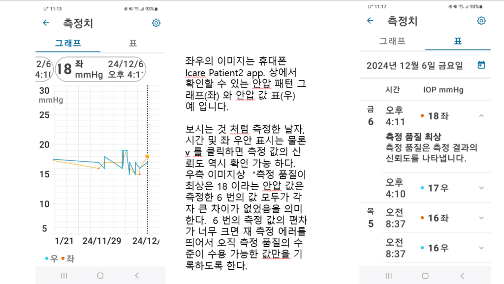 위에서 보시는 것 처럼 iCare Patient 2 App 을 사용하면 안압 데이터 를 따로 기록할 필요가 없고 내 안압의 변동 그래프는 물론 최고, 최저 및 변동폭 등 다양한 통계 데이터를 확인할 수 있어 치료 효과 확인은 물로 치료 방법을 결정 하는등 녹내장 관리에 유용하게 쓸 수 있어 iCare HOME2 안압계를 사용하는 분들은 반드시 앱에 연동하여 쓰실 것을 권합니다.